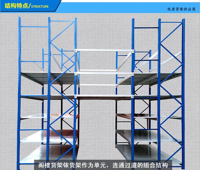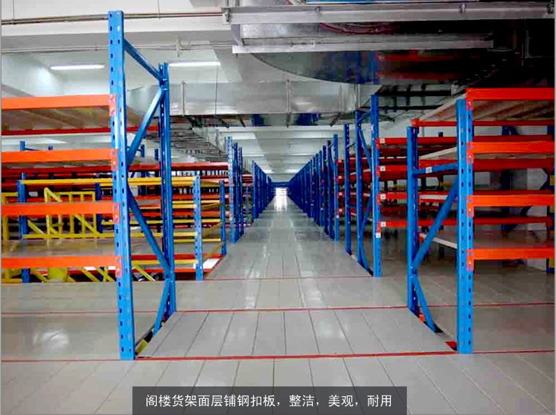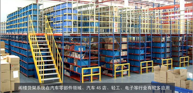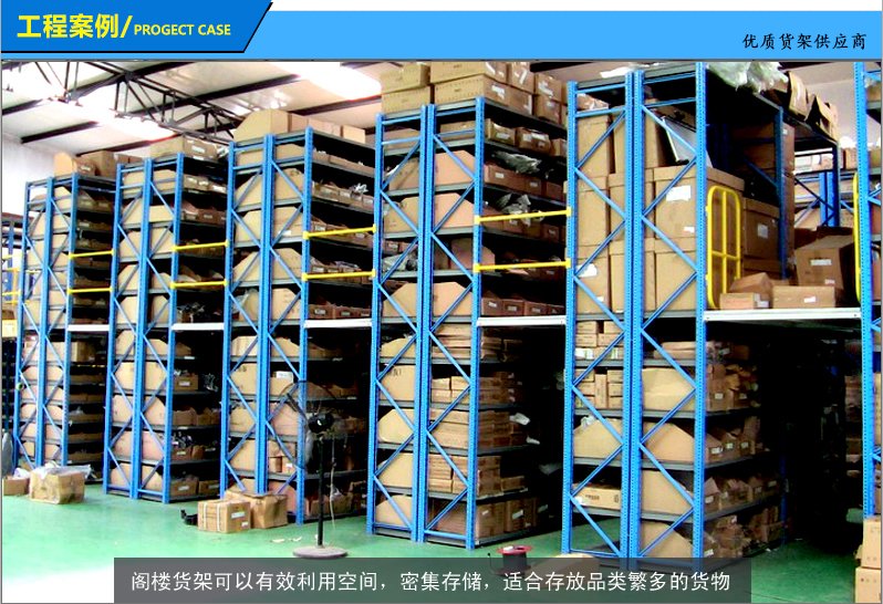 是在廠房地板面積有限的情形下,利用鋼梁和金屬板將原有儲區作樓層區分,每個樓層可放置不同的種類的貨架,而貨架結構具有支撐上層樓板的作用。閣樓式貨架在倉儲設備中占有著十分重要的地位,閣樓式貨架的應用實現了倉庫管理的現代化進程,全面提升倉庫的功能。