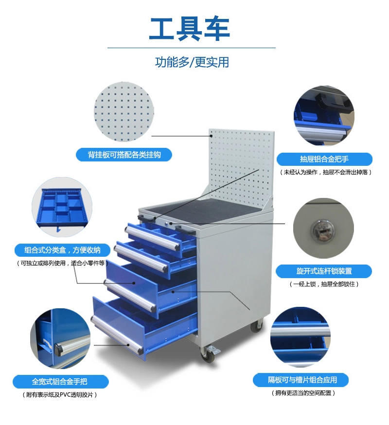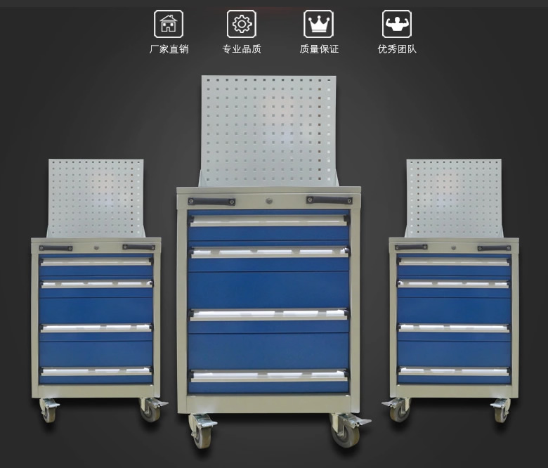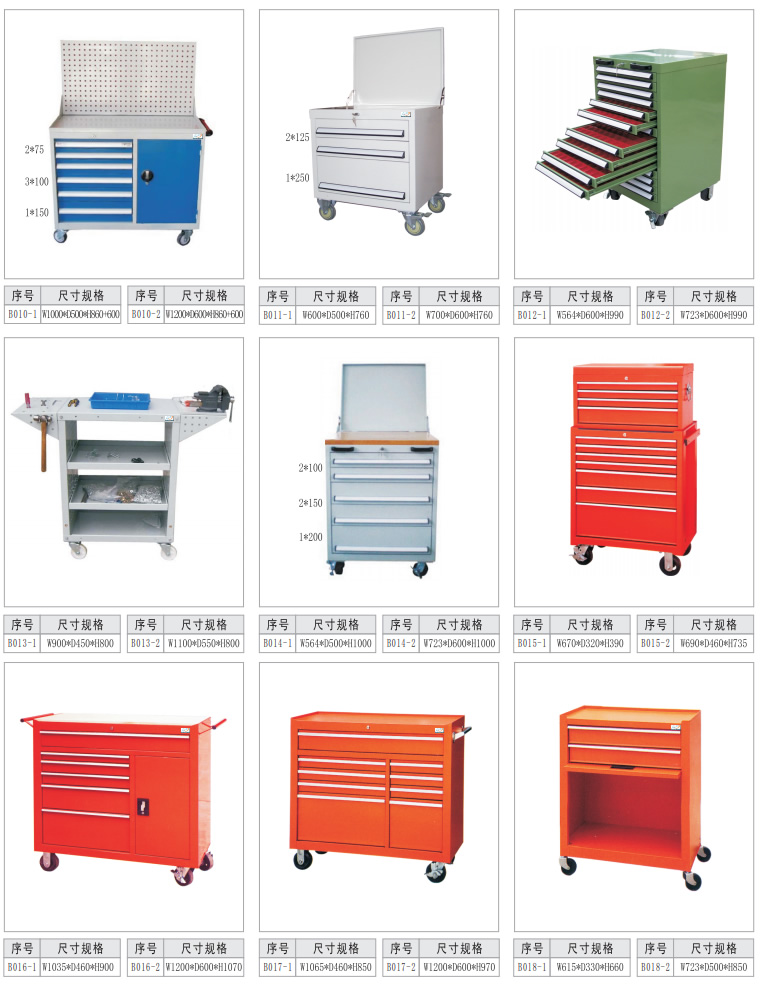 2、工具車由各種型號的工具柜增加頂柜和腳輪等移動部件組成。